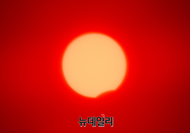 부분일식 현상이 21일 오후 서울 상공에서 일어나고 있다. 오늘 일식은 달이 해의 일부를 가리는 부분일식으로 일식 면적은 태양 면적의 45%다.