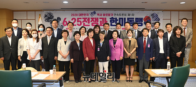 정경희 미래통합당 의원, 이인호 서울대학교 명예교수(전 러시아대사), 김승욱 중앙대학교 명예교수, 강규형 명지대학교 교수, 남정욱 작가, 이춘근 한국해양전략연구소 선임연구위원, 김재원 통일허브연합 대표 여명 미래통합당 서울시의원, 전희경 전 통합당 의원, 김예지 의원 등 참석자들이 22일 오전 국회 의원회관에서 열린 6.25전쟁과 한미동맹 토론회에서 기념촬영을 하고 있다.