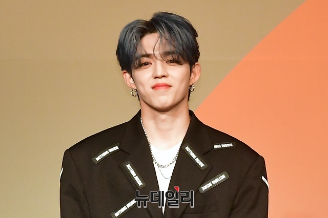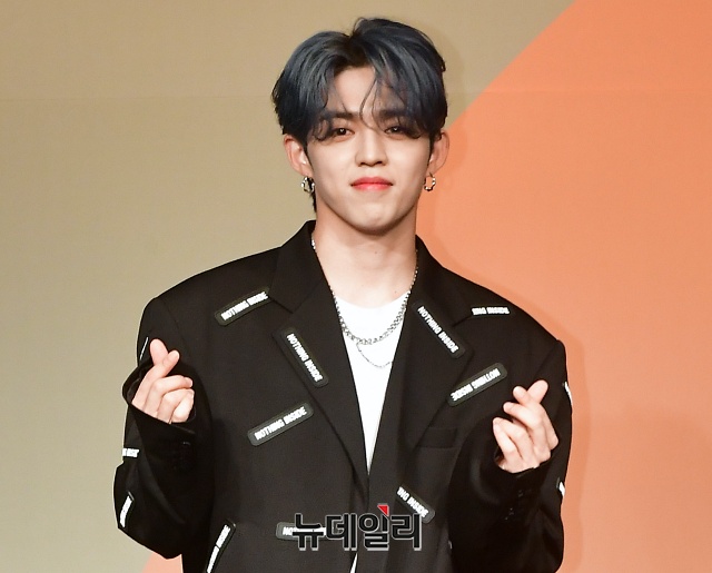 세븐틴 멤버 에스쿱스가 22일 오후 서울 강남구 인터컨티넨탈 서울 코엑스에서 열린 세븐틴 미니7집 '헹가래' 발매 기자간담회에서 포토타임을 갖고 있다.
