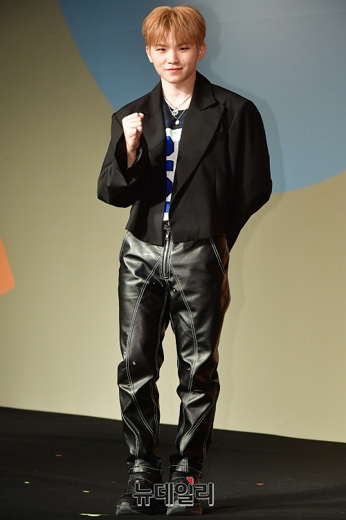 세븐틴 멤버 우지가 22일 오후 서울 강남구 인터컨티넨탈 서울 코엑스에서 열린 세븐틴 미니7집 '헹가래' 발매 기자간담회에서 포토타임을 갖고 있다.