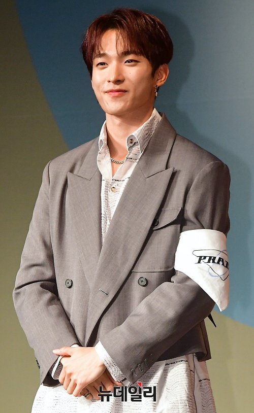 세븐틴 멤버 도겸이 22일 오후 서울 강남구 인터컨티넨탈 서울 코엑스에서 열린 세븐틴 미니7집 '헹가래' 발매 기자간담회에서 포토타임을 갖고 있다.