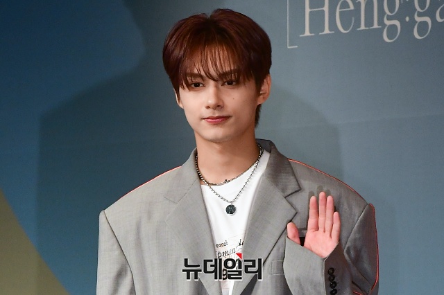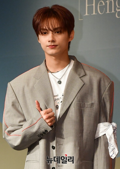 세븐틴 멤버 준이 22일 오후 서울 강남구 인터컨티넨탈 서울 코엑스에서 열린 세븐틴 미니7집 '헹가래' 발매 기자간담회에서 포토타임을 갖고 있다.