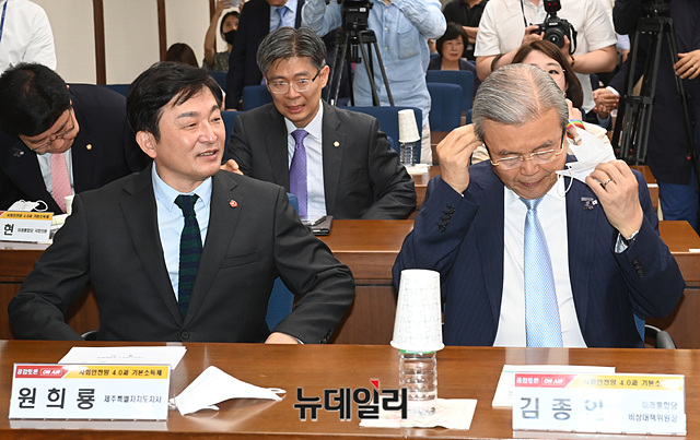 김종인 미래통합당 비상대책위원장이 23일 오전 국회 도서관에서 열린 사회안전망 4.0 정책토론회에서 원희룡 제주지사와 악수를 나누고 있다.