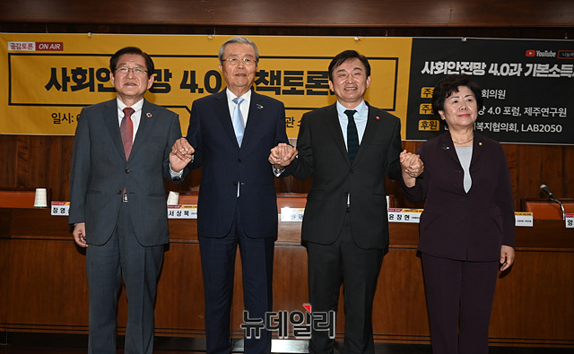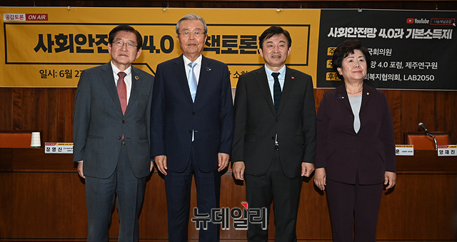 김종인 미래통합당 비상대책위원장, 원희룡 제주지사, 서상목 사회안전망 4.0대표, 서정숙 통합당 의원이 23일 오전 국회 도서관에서 열린 사회안전망 4.0 정책토론회에서 기념촬영을 하고 있다.