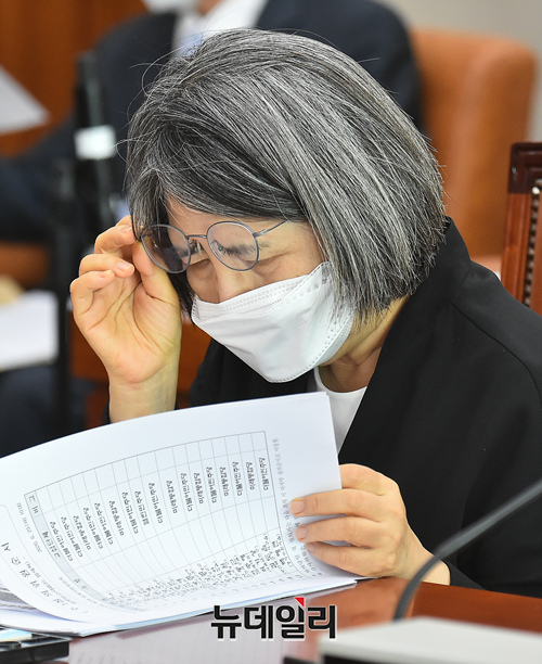 김영란 대법원 양형위원장이 23일 오전 국회에서 열린 법제사법위원회 전체회의에서 자료를 검토하고 있다.