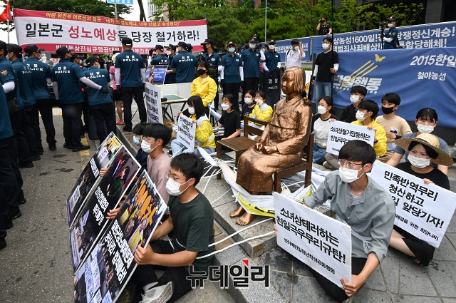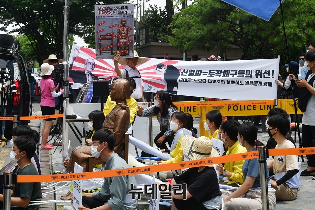 반일동상진실규명공대위(공대위)가 23일 오후 서울 종로구 위안부소녀상 인근에서 반아베반일청년학생공동행동 소속 대학생들과 소녀상을 사이에 두고 대치하고 있다.