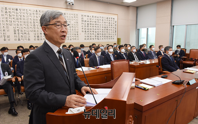 최재형 감사원장이 24일 오전 국회에서 열린 법제사법위원회 전체회의에서 업무보고를 하고 있다.