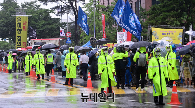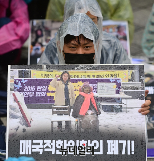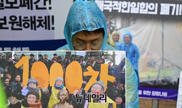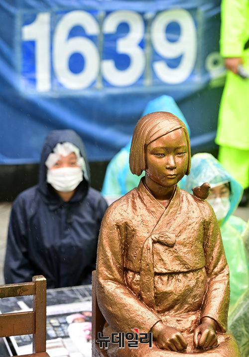 반일행동 소속 대학생들이 위안부 수요집회가 열린 24일 오후 서울 종로구 위안부소녀상을 지킨다는 명목으로 소녀상을 중심으로 밧줄과 현수막을 이용해 몸을 묶고 연좌농성 중이다.28년간 정의연 수요집회를 이어오던 위안부소녀상 앞 자리는 자유연대가 23일부터 7월 중순까지 집회신고를 한 상태다.자유연대는 반일행동의 집회방해로 소녀상 왼쪽에서 집회를 이어갔다. 집회신고 순위에 밀려난 정의연 수요집회는 소녀상 오른쪽에서 집회를 열었다.경찰은 충돌을 막기 위해 인력을 대거 투입했다.