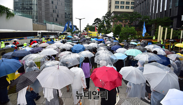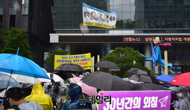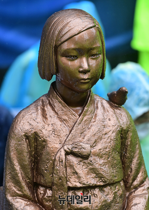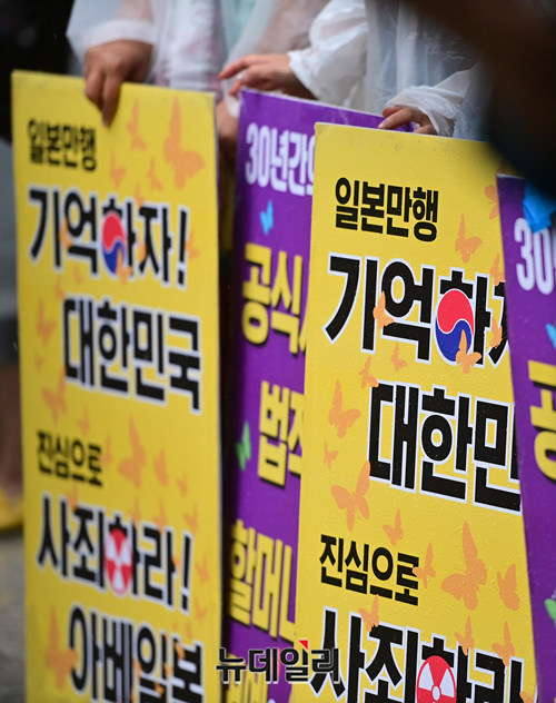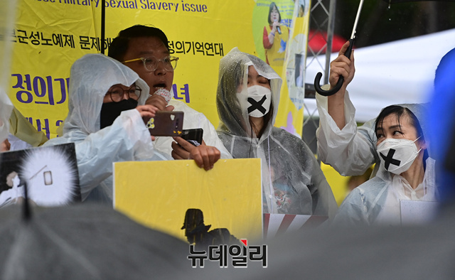 정의연의 위안부 수요집회 참가자가 24일 오후 서울 종로구 위안부소녀상 옆에서 열린 수요집회에서 손피켓을 들고 집회에 참가하고 있다.28년간 위안부소녀상 앞에서 집회를 이어가던 정의연은 자유연대의 집회신고로 우선순위에 밀려 연합뉴스 사옥 앞으로 옮겨 집회를 이어갔다. 자유연대는 23일부터 7월 중순까지 위안부 소녀상 앞에서 집회신고를 마친 상태다.반일행동 소속 대학생들은 위안부 소녀상을 지킨다는 명목으로 밧줄과 현수막으로 소녀상과 본인의 몸을 이어 연좌농성 중이다.