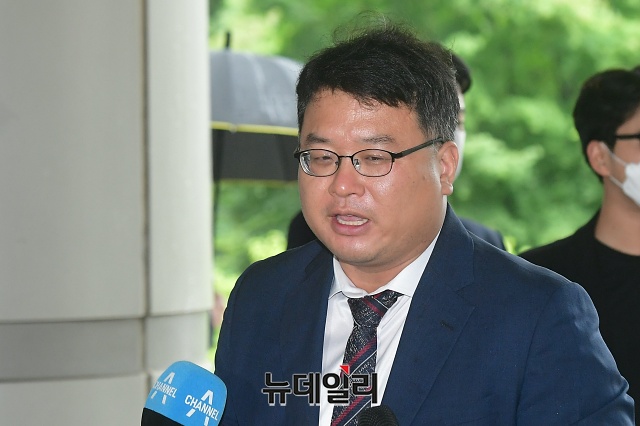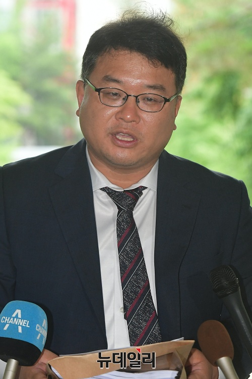 '위안부할머니기부금및후원금반환소송대책모임' 소송 대리인 김기윤 변호사가 24일 오후 서울 서초구 서울중앙지법 앞에서 나눔의집 후원금 반환소송 관련 기자회견을 갖고 있다.