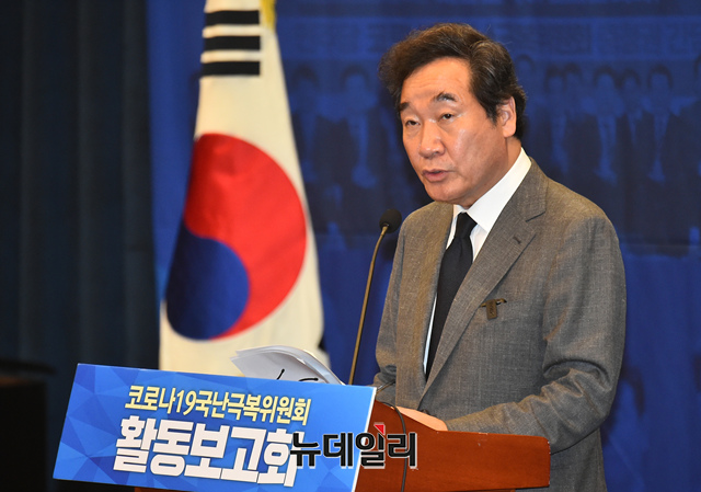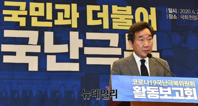 이낙연 더불어민주당 코로나19국난극복위원회 위원장이 24일 오후 국회 헌정기념관에서 열린 코로나19 국난극복위원회 활동보고회에서 발언을 하고 있다.