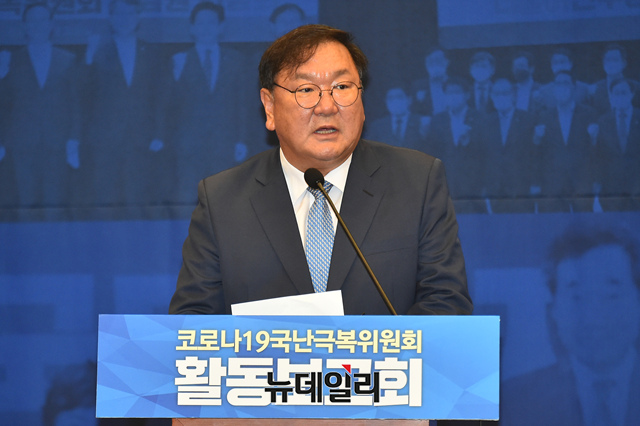 김태년 더불어민주당 원내대표가 24일 오후 국회 헌정기념관에서 열린 코로나19 국난극복위원회 활동보고회에서 발언을 하고 있다.