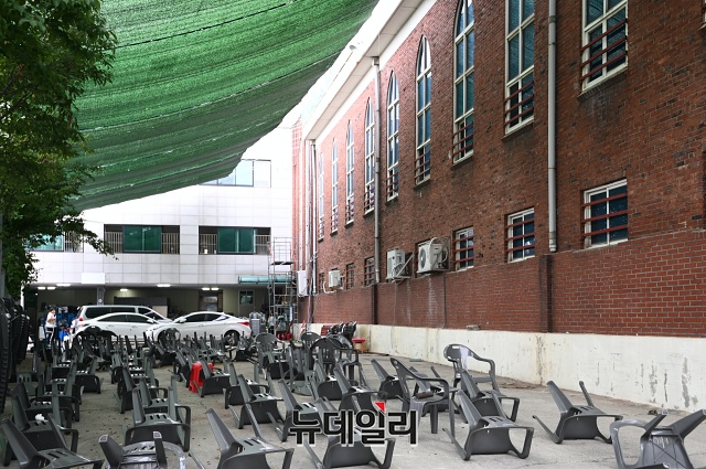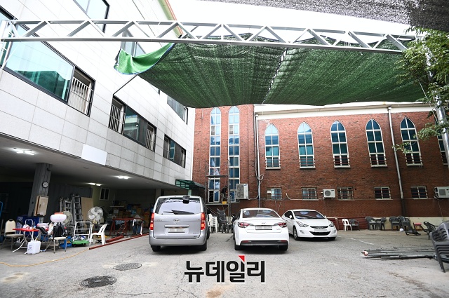 서울 성북구 장위동에 위치한 사랑제일장로교회 앞마당에 24일 오전 천막이 쳐져있다. 이 교회가 위치한 장위10구역은 재개발 구역으로 대부분 주민들이 떠난 상황이다.