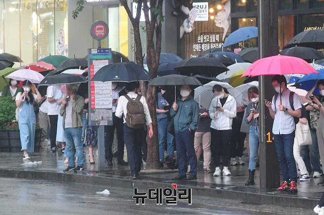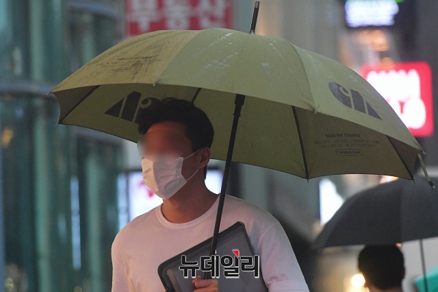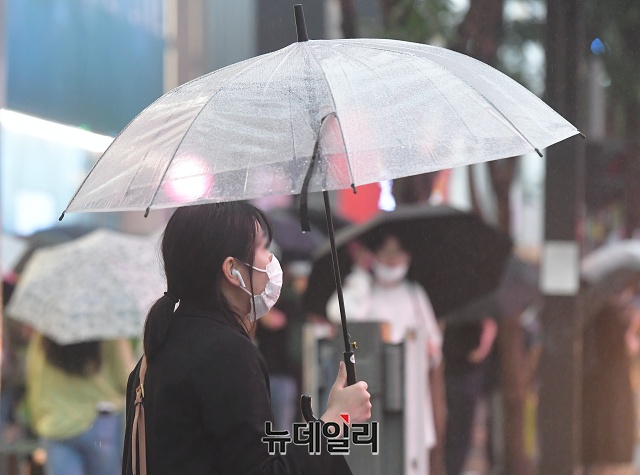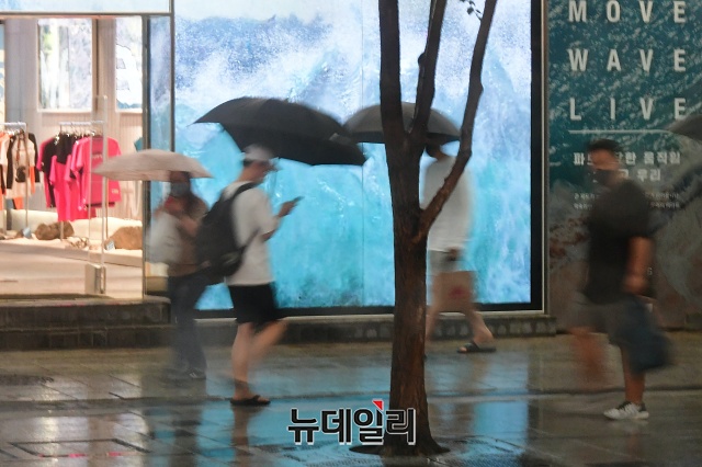 퇴근하는 직장인들이 24일 오후 서울 서초구 강남역 인근에서 우산을 쓰고 이동하고 있다.