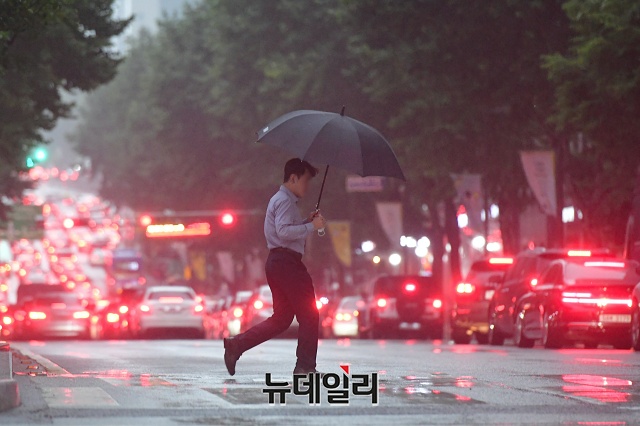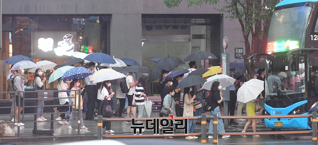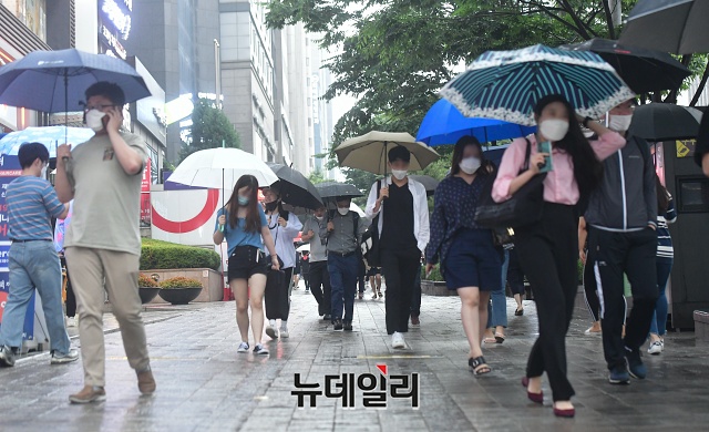 퇴근하는 직장인들이 24일 오후 서울 서초구 강남역 인근에서 우산을 쓰고 이동하고 있다.