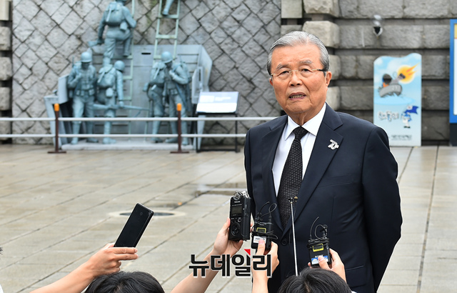 6.25전쟁 70주년인 25일 오후 김종인 미래통합당 비상대책위원장이 인천 연수구 인천상륙작전기념관 자유수호의 탑에 참배를 미치고 기자들의 질문에 답하고있다. (인천=이종현 기자)