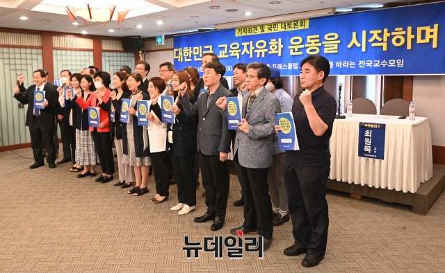사회정의를바라는전국교수모임(정교모)을 비롯한 참석자들이 25일 오후 서울 중국 한국프레스센터에서 열린 ‘대한민국 교육자유화 운동’ 기자회견 및 토론회에서 기념촬영을 하고 있다.이들은 "현재 우리 사회의 교육은 학생들에게 올바른 역사관과 국가관을 길러주지 못하고 입시제도의 불투명 속에 공정성의 논란은 끊이지 않는다"며 "모두를 위한 바른 교육의 방향을 제시해야 한다"고 밝혔다.토론회는 이미현 연세대 교수가 사회를 맡았다. 이어진 자유발언은 이제봉 울산대 교수, 심임섭 복잡성교육연구소장, 박소영 학부모 대표, 최원목 이화여대 교수, 조성환 경기대 교수 등이 발표했다.