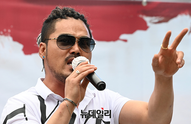 안정권 GZSS 대표, 김상진 자유연대 대표, 최정훈 북한인민해방전선 대표가 25일 오후 서울 중구 주한 중국대사관 앞에서 열린 6.25전쟁 70주년 시민대회에서 각각 연사를 하고 있다.