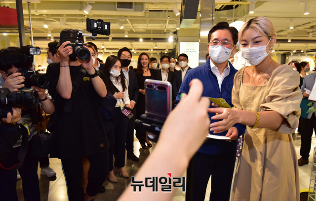 성윤모 산업통상자원부 장관과 모델 송해나가 26일 오전 서울 송파구 롯데백화점에서 열리고 있는 '코리아패션마켓' 행사에서 SNS 라이브 방송을 하고 있다.