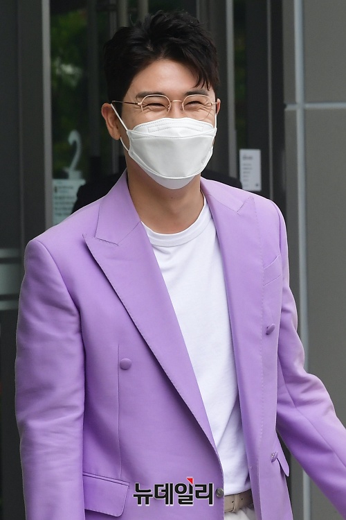 가수 영탁(왼쪽), 배우 박해진이 26일 오전 서울 마포구 상암 MBC에서 '꼰대인턴 방구석 팬미팅' 녹화를 위해 입장하고 있다.