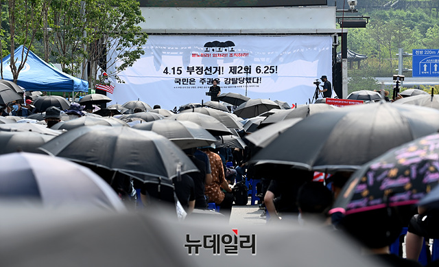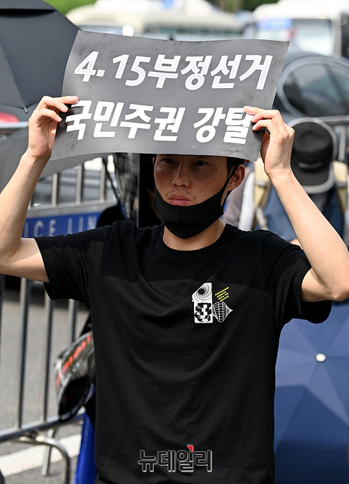 '4.15 총선 부정 진상 규명 범 국민대회'가 열린 27일 오후 서울 서초구 대법원 앞에서 시민들이 손 피켓을 들고 자리하고 있다.시민들은 '민주주의 사망' '4.15 부정선거 국민주권 강탈' '4.15 선거조작 진실을 규명하라' 등이 기재된 손 피켓을 들고 참석했다. 이날 국민대회에는 중장년층, 청년층 등 다양한 연령대의 시민들이 참석했다.이날 열린 국민대회는 문재인 정부의 4.15 부정선거를 규탄하고 대한민국을 바로 세우기 위해 열렸다. 국민대회는 민경욱 전 미래통합당 의원 등 주요 연사의 발언 직후 참석자 전원이 대법원 일대를 가두행진 할 예정이다.