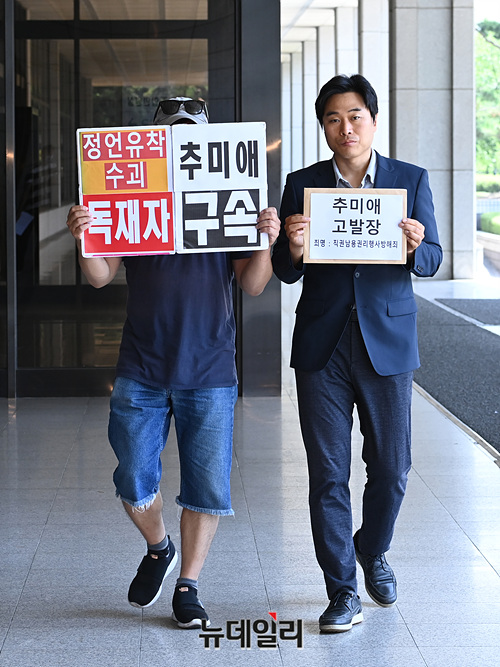 이종배 법치주의바로세우기행동연대 대표가 28일 오전 서울 서초구 중앙지검에서 추미애 법무부 장관 고발 기자회견을 마친 직후 고발장을 제출하고 있다.