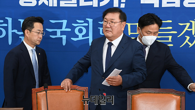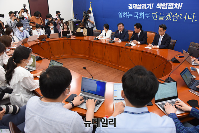 [포토] 여야 국회 원구성 최종 협상 결렬…간담회 갖는 김태년