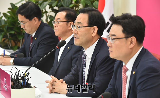 주호영 미래통합당 원내대표가 29일 오전 국회 원내대표실에서 열린 긴급기자회견에서 원구성 협상 결렬에 관련 설명을 하고 있다.