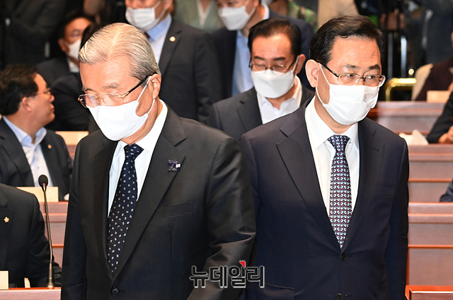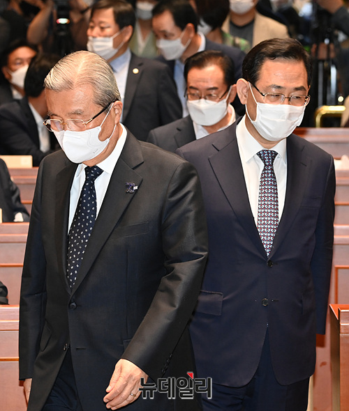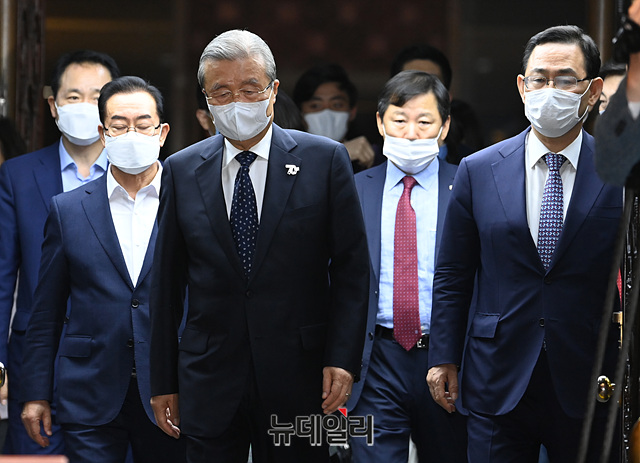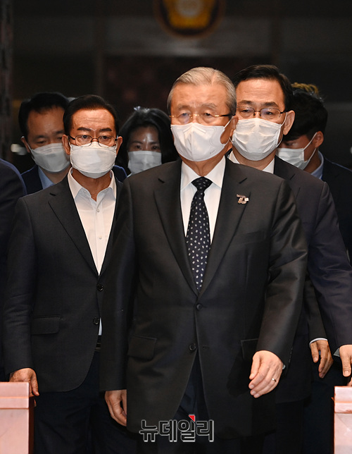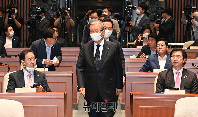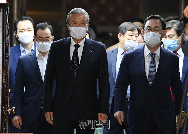 김종인 미래통합당 비상대책위원장, 주호영 원내대표 등 지도부가 29일 오후 국회에서 열린 의원총회에 입장하고 있다.