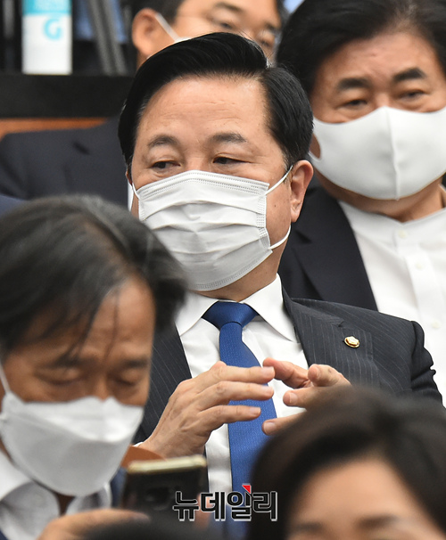 김두관 더불어민주당 의원이 29일 오후 국회에서 열린 의원총회에 참석해 회의를 지켜보고 있다.