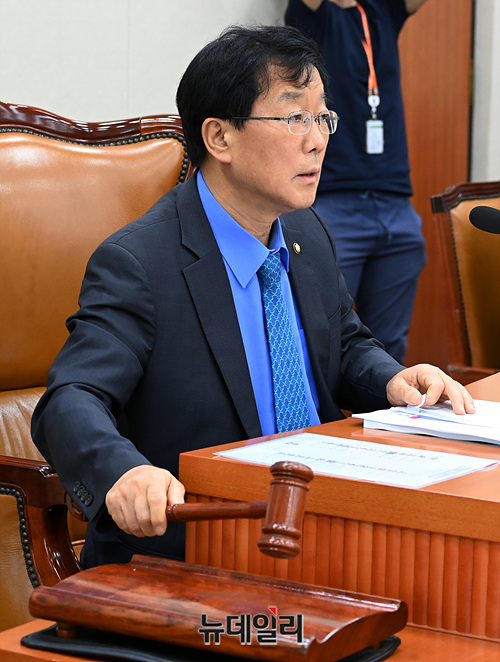 윤후덕 기획재정위원장이 29일 오후 국회에서 열린 기재위 전체회의에서 의사봉을 두드리고 있다.