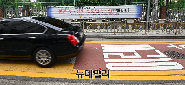 불법 주·정차 집중단속·신고 현수막이 29일 오후 서울시내 한 초등학교 앞에 걸려있다.행정안전부는 오늘부터 '어린이 보호구역 내 불법 주정차 주민신고제'를 시행한다고 밝혔다.'어린이 보호구역' 내 불법 주정차된 차량을 1분 간격으로 2장 촬영해 안전신문고 앱으로 신고하면 단속 공무원의 현장확인 없이 즉시 과태료를 부과한다.주말과 공휴일을 제외한 평일 오전 8시부터 오후 8시까지 운영된다. 적발된 차량은 승용차 기준 8만원의 과태료가 부과된다.
