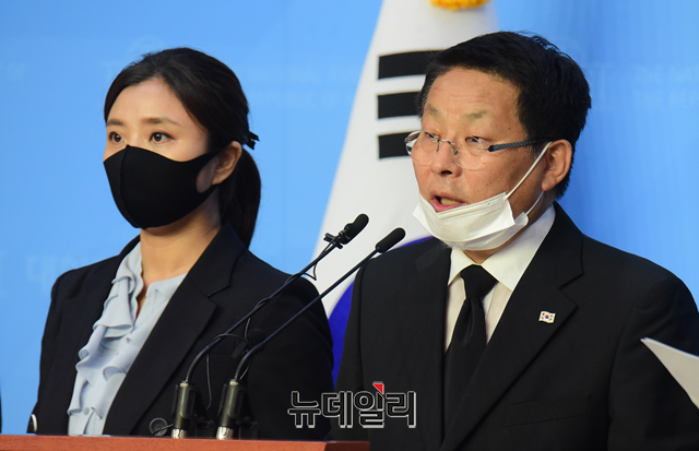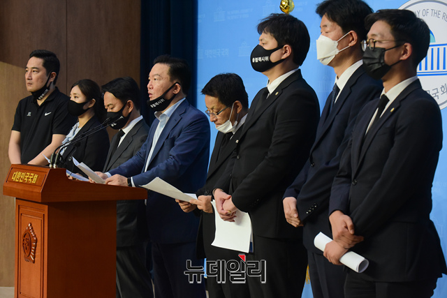 제21대 총선 무효소송을 제기한 민경욱, 차명진, 강용석 전 의원 등이 30일 국회 소통관에서 대법원의 수개표 즉시 실시를 요구하는 성명서를 발표하고 있다.