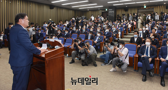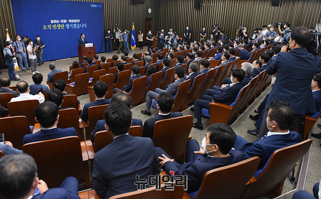 김태년 더불어민주당 원내대표가 1일 오전 국회에서 열린 정책 의원총회에서 모두발언을 하고 있다.