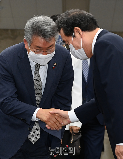 당대표 출마를 선언한 이낙연 더불어민주당 의원이 1일 오전 국회에서 열린 정책 의원총회에 참석해 동료 의원들과 인사를 나누고 있다.