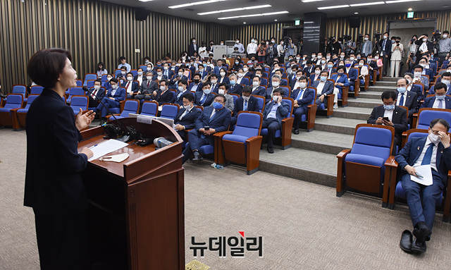 한정애 더불어민주당 의원이 1일 오전 국회에서 열린 정책 의원총회에서 모두발언을 하고 있다.