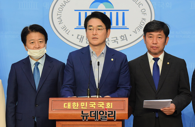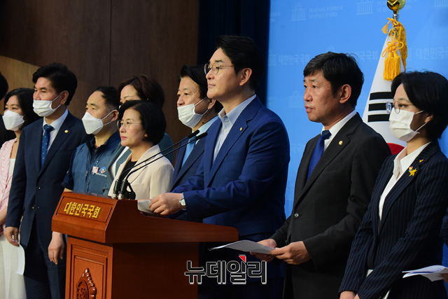 박용진 더불어민주당 의원, 류호정 정의당 의원, 강민정 열린민주당 의원 등 참석자들이 1일 오전 국회 소통관에서 이재용 삼성전자 부회장 기소 촉구 기자회견을 갖고 있다.