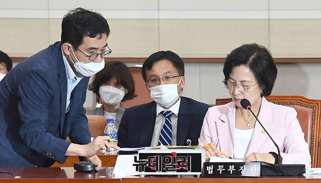 추미애 법무부장관이 1일 오후 국회에서 열린 법제사법위원회 전체회의에 참석해 보좌진과 대화를 나누고 있다.