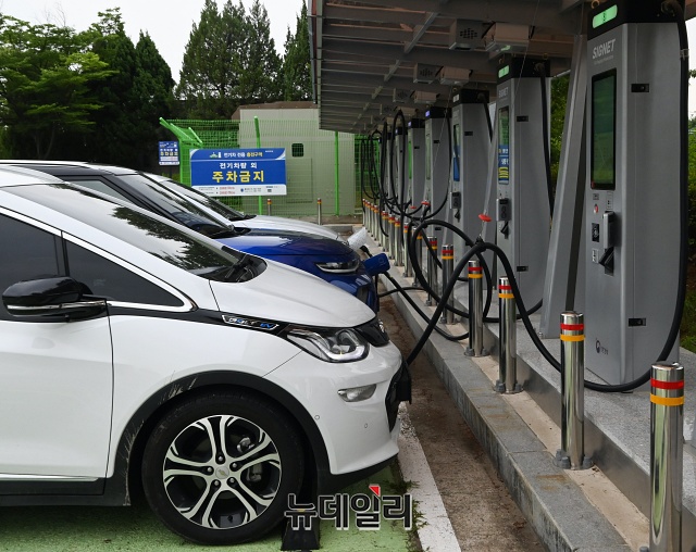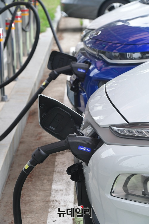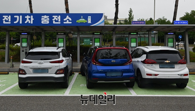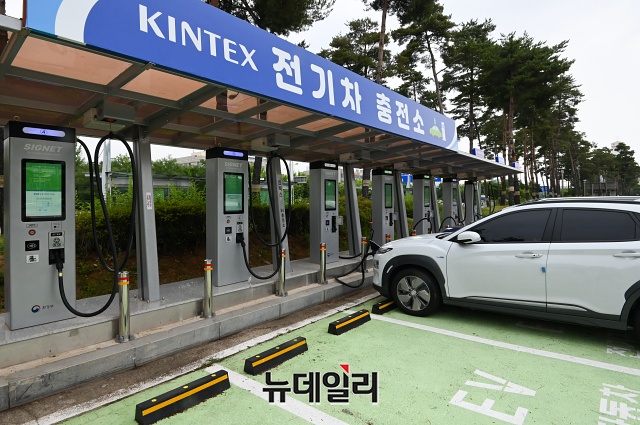 경기 고양시 킨텍스 전기차 충전소에서 1일 오후 전기자동차가 충전을 하고 있다.환경부와 한국전력공사는 1일부터 전기차 급속 충전요금을 기존 1kWh당 173원에서 250원대로 인상한다고 밝혔다. 완속 충전요금도 현재 1kWh당 60~100원 하는 요금을 3배 정도 오른 200원 초반으로 책정했다.현대자동차 '코나 일렉트릭' 경우 완전 충전까지 완속 충전하면 기존 4,000~6,000원에서 12,000~14,000원 가량 지출된다. 급속 충전은 11,000원에서 16,000원이 들게 된다. (경기 고양=권창회 기자)