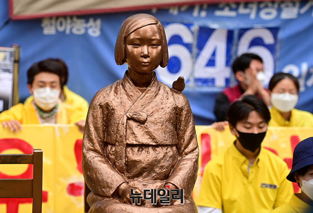반일행동 소속 대학생들이 위안부 수요집회가 진행중인 1일 정오 서울 종로구 옛 일본대사관 앞 위안부 소녀상을 점거하고 연좌농성을 이어가고 있다.