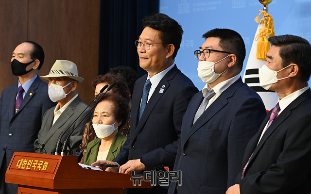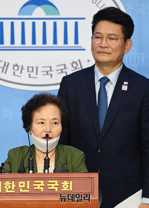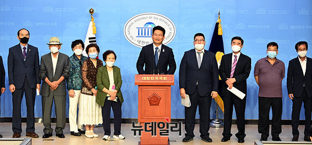 국회 외통위 위원장인 송영길 더불어민주당 의원, 위안부 피해 할머니 유족, 강제징용 피해자 유족 등이 2일 오전 국회 소통관 기자회견장에서 열린 '이영훈 교수 등 반일종족주의와의 투쟁 빕필진 및 류석춘 교수 고소 기자회견'을 갖고 있다.