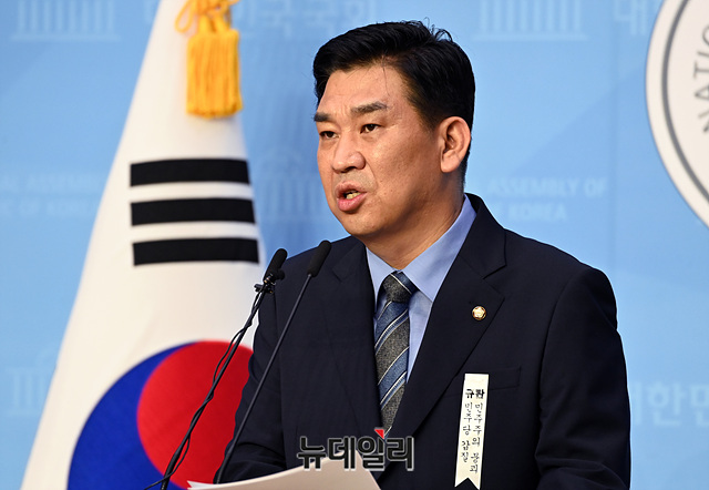 소상공인연합회 회장 출신 최승재 미래통합당 의원이 2일 오전 국회 소통관 기자회견장에서 최저임금 관련 기자회견을 갖고 있다.