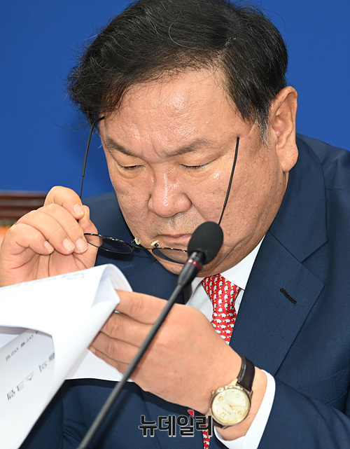 김태년 더불어민주당 원내대표가 2일 오전 국회에서 열린 정책조정회의에 참석해 관련 자료를 보고 있다.