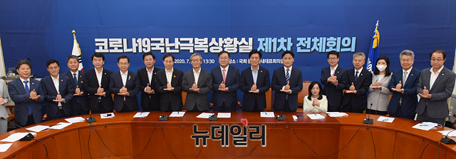 김태년 더불어민주당 원내대표, 조승래 상황실장 등 참석자들이 2일 오후 국회에서 열린 코로나19 국난극복상황실 제1차 전체회의에서 기념촬영을 하고 있다.