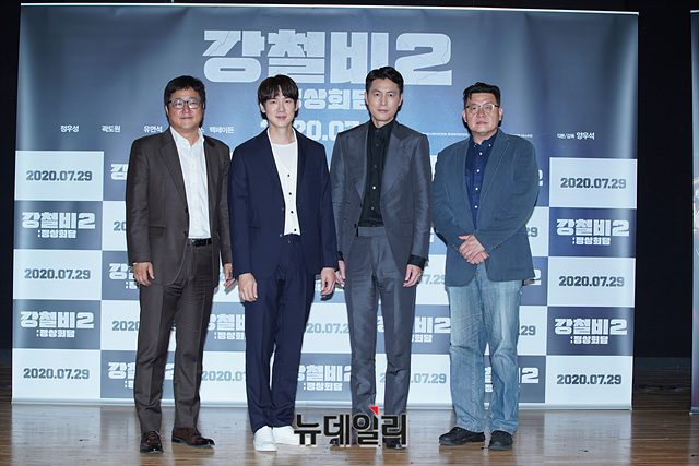 배우 곽도원(왼쪽부터), 유연석, 정우성, 감독 양우성이 2일 오전 온라인으로 진행된 '강철비2: 정상회담' 제작발표회에서 포토타임을 갖고 있다.