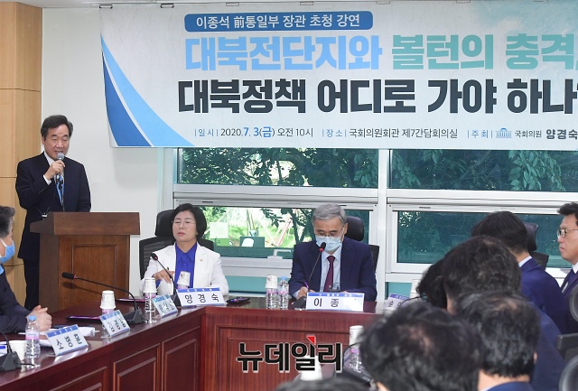 이낙연 더불어민주당 의원이 3일 오전 국회 의원회관에서 열린 '대북전단지와 볼턴의 충격, 대북정책 어디로 가야하나' 강연회에서 축사를 하고 있다. 강연은 이 전 장관이 맡았다.