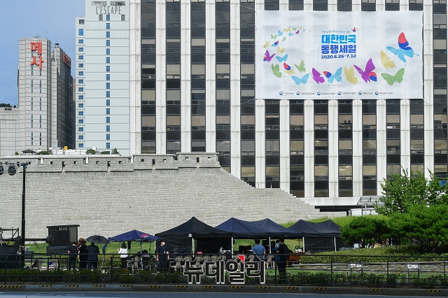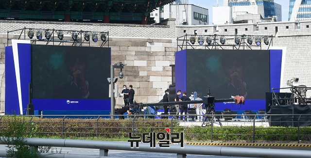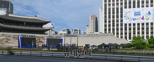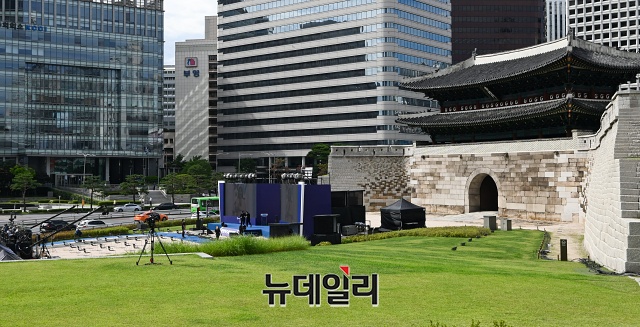 '대한민국 동행세일 특별행사' 관계자들이 3일 오후 서울 중구 숭례문에서 열리는 무대를 준비하고 있다.