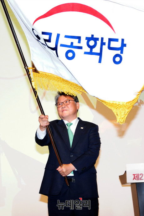 우리공화당 2기 지도부 당대표에 선출된 조원진 대표가 4일 오후 경기 고양 킨텍스에서 열린 '제2차 전국대의원대회'에서 당선 소감을 마친 뒤 당기를 흔들고 있다.