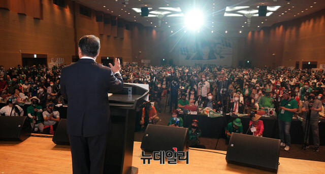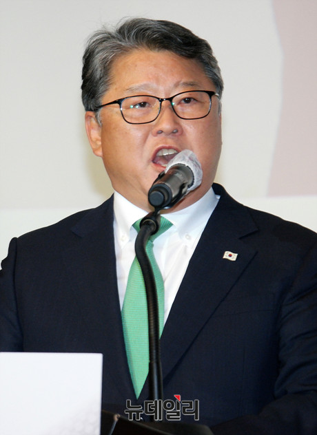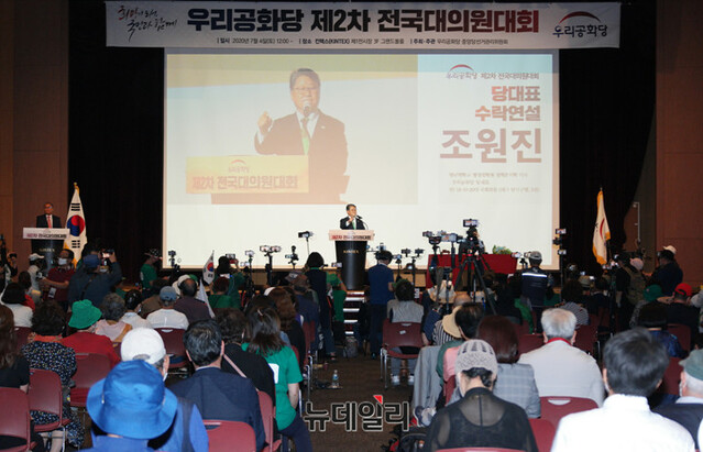 우리공화당 2기 지도부 당대표에 선출된 조원진 대표가 4일 오후 경기 고양 킨텍스에서 열린 '제2차 전국대의원대회'에서 당대표 수락연설을 하고 있다.
