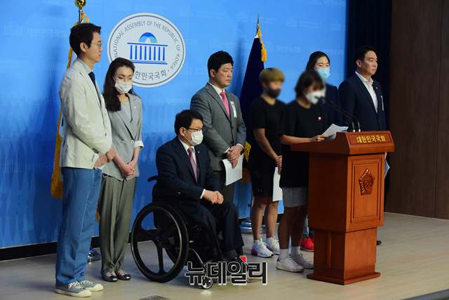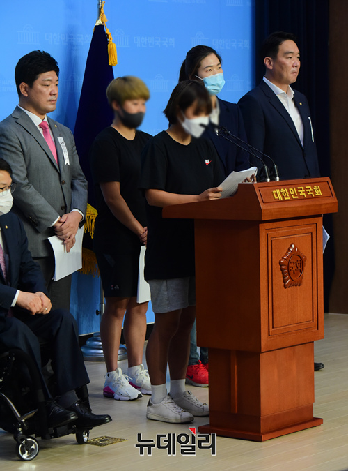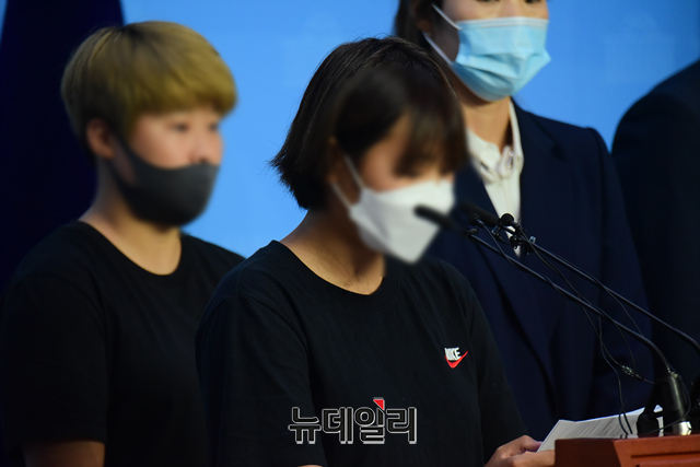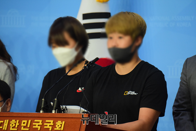 폭행과 학대로 유명을 달리한 故 최숙현 선수와 경주시청 트라이애슬론 선수 생활을 함께한 선수들이 6일 오전 국회 소통관에서 추가폭로 기자회견을 갖고 가해자로 지목된 감독 A씨, 주장 B씨, 팀닥터 C씨의 폭행, 성추행, 폭언, 사기, 협박 등 악행을 증언하고 있다.